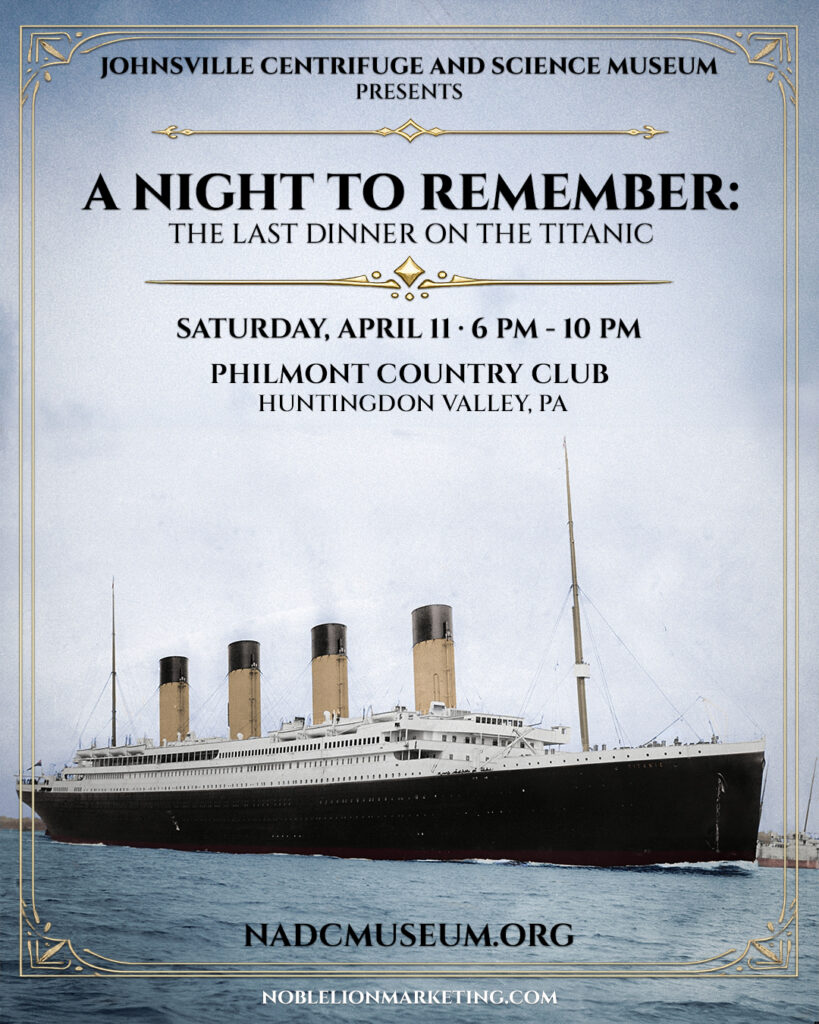 Noble Lion Marketing is proud to support the Johnsville Centrifuge and Science Museum in promoting “A Night to Remember: The Last Dinner on the Titanic,” a special fundraising event taking place Saturday, April 11, at Philmont Country Club in Bucks County. This elegant evening will recreate the final First Class dinner served aboard the RMS Titanic while raising support for the museum’s mission to preserve the history of the historic Johnsville Centrifuge facility and its important role in American scientific innovation and aerospace research.